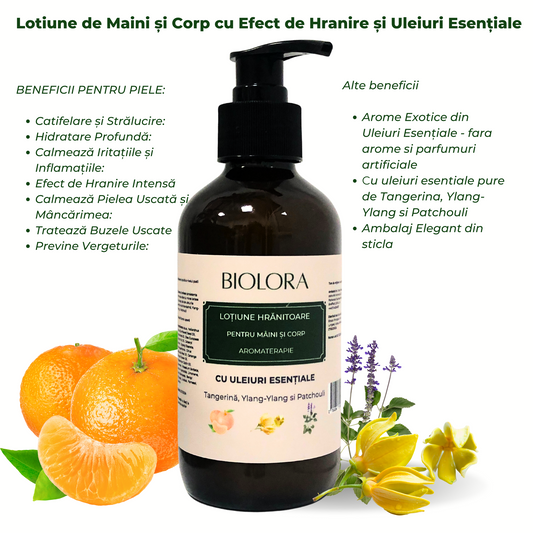 Lotiune de Maini și Corp Biolora cu Efect de Hranire și Uleiuri Esențiale de Tangerină, Ylang-Ylang și Patchouli, 250 ml